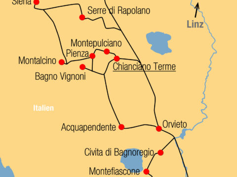 Bei dieser Entdeckungsreise lernen Sie die Kunststädte Siena, Orvieto und Pienza sowie die Weinorte Montepulciano und Montalcino kennen. Einmalige Highlights sind die…